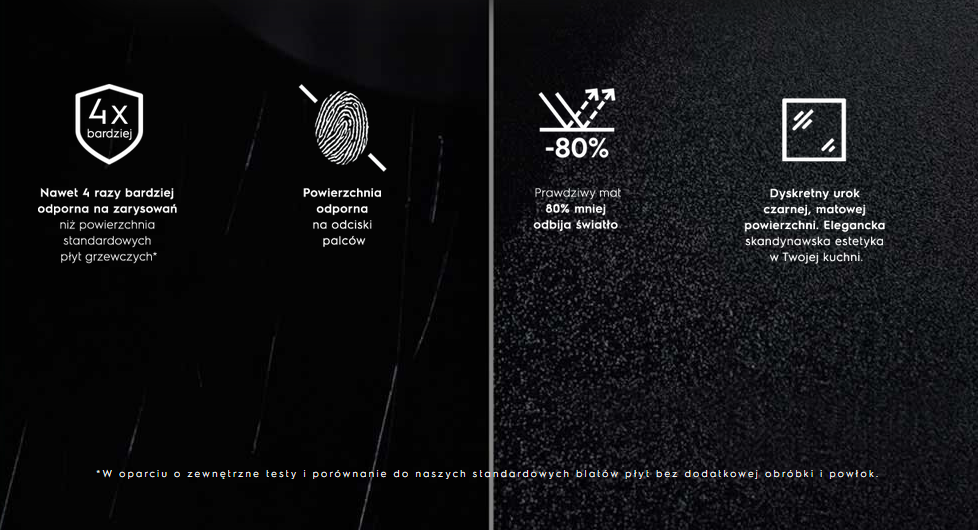 Szkło SaphirMatt® jest do 4 razy bardziej odporne na zarysowania niż standardowe szkło.* *W oparciu o zewnętrzne testy i porównanie do naszych standardowych blatów płyt bez dodatkowej obróbki i powłok.