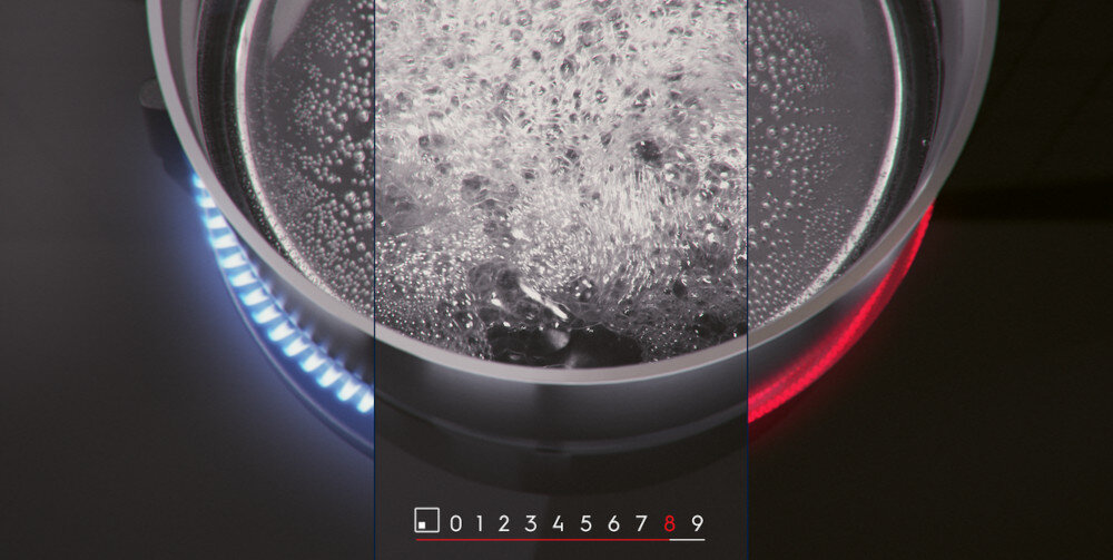 Postawienie naczynia na płycie grzejnej powoduje automatyczne podświetlenie suwakowego elementu sterującego. Pozwala to intuicyjnie sterować urządzeniem. Wystarczy wybrać ustawienie mocy, przesuwając palcem, aby szybko rozpocząć gotowanie.