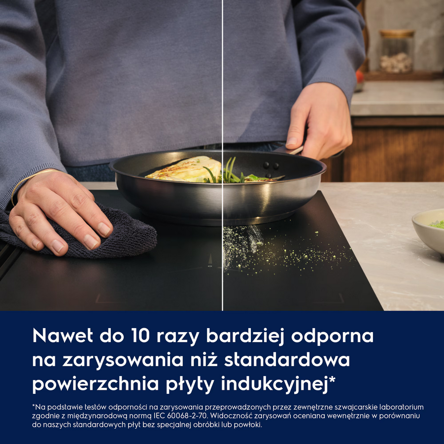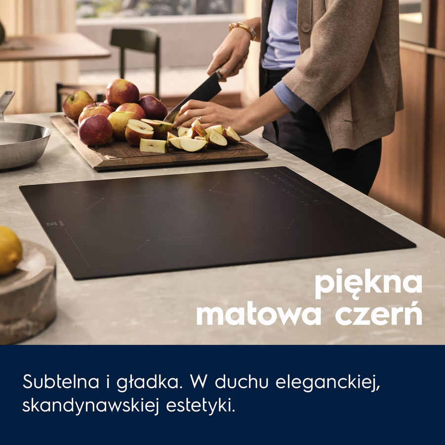 Płyta indukcyjna SaphirMatt® KIS67453IZ o szerokości 60 cm zapewnia inteligentne i szybkie gotowanie dzięki czujnikom SenseBoil & Fry, które automatycznie dostosowują poziom ciepła, zapobiegając przegotowaniu i utrzymując idealną temperaturę smażenia. Czarna, matowa powierzchnia SaphirMatt® to synonim trwałej elegancji, nawet 10 razy bardziej odporna na zarysowania* i idealnie komponująca się z każdą kuchnią. Funkcja Bridge pozwala połączyć dwie strefy grzejne w jedną większą, idealną do dużych garnków, patelni i płyt grillowych Plancha, zapewniając równomierne rozprowadzanie ciepła. Dzięki funkcji Hob2Hood® płyta automatycznie współpracuje z kompatybilnym okapem, dostosowując jego moc do potrzeb gotowania, co zwiększa komfort użytkowania.