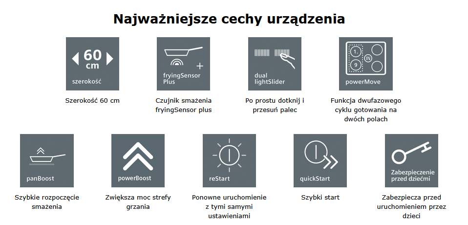 Płyta grzejna ma standardową szerokość, dlatego sprawdzi się w większości kuchni. Do wyboru masz dość dużo poziomów mocy, dlatego z łatwością dopasujesz należytą temperaturę do konkretnych rodzajów potraw, np. do smażenia filetów, duszenia czy rozpuszczania masy krówkowej. Tę płytę obsługuje się przy użyciu dotykowego panelu sterującego. Takie rozwiązanie ma dużo atutów - gwarantuje szybki dostęp do nowoczesnych opcji, pozwala na dokładne wyregulowanie mocy grzania i umożliwia niezwłoczną reakcję w przypadku nieprzewidzianych zdarzeń. Dzięki innowacyjnej funkcji Booster możesz jeszcze szybciej przyrządzać potrawy. Ten system powiększa moc konkretnego pola grzejnego nawet o kilkadziesiąt procent, co ma duży wpływ na szybkość gotowania.
