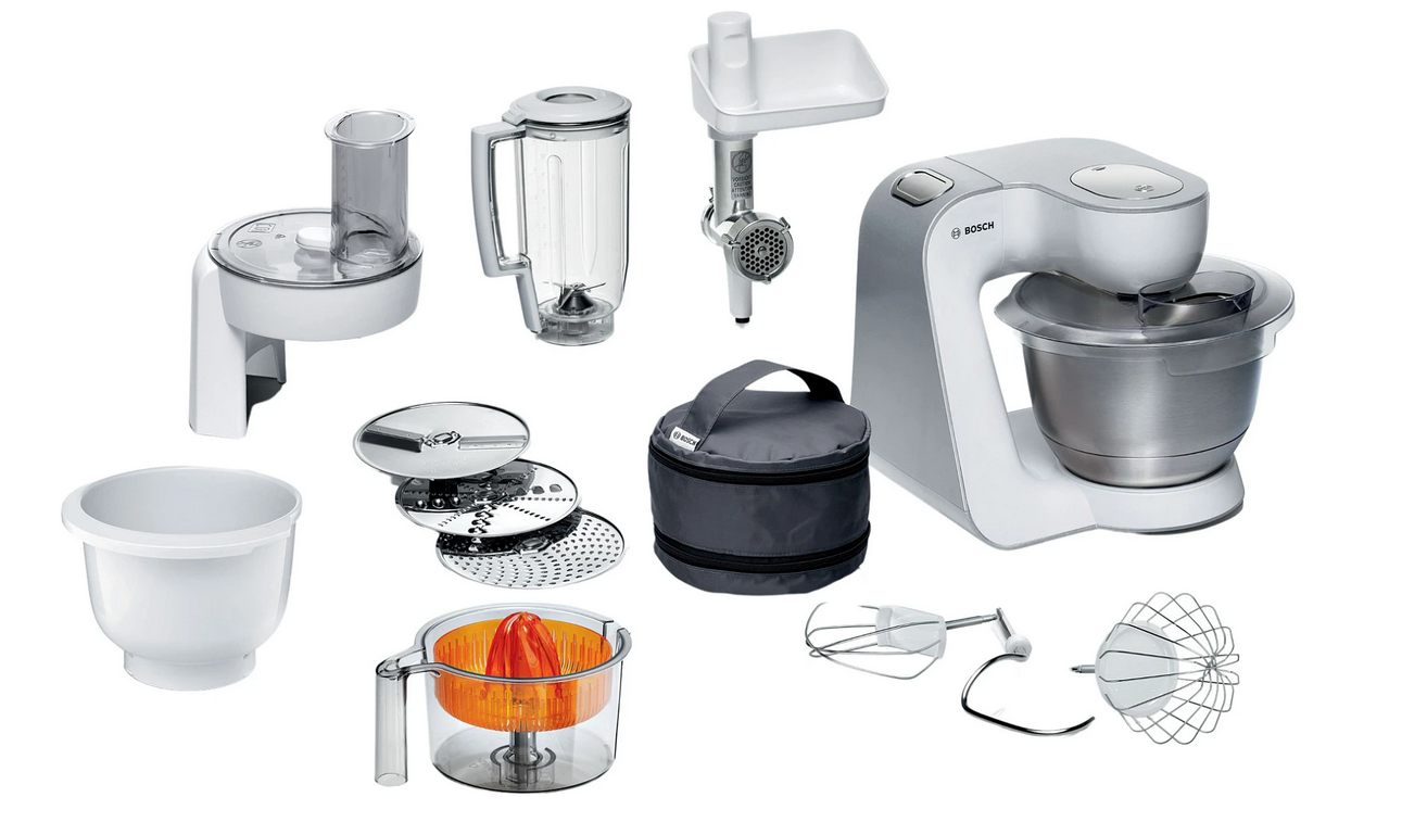 Misa ze stali szlachetnej 3,9 l, Misa z tworzywa sztucznego, Hak do zagniatania ciasta, Końcówka do ubijania, Końcówka do mieszania, Rozdrabniacz do warzyw i owoców z 3 wymiennymi tarczami (tarcza dwustronna do krojenia na plasterki, tarcza dwustronna do krojenia na wiórki, tarcza do drobnego tarcia), Kielich blendera 1,25 l, Wyciskarka do cytrusów, Maszynka do mielenia, Przezroczysta pokrywa misy, Etui do przechowywania wyposażenia