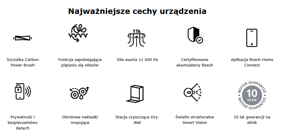 - Aplikacja Bosch Home Connect: łatwe połączenie z robotem, intuicyjna obsługa, czytelne powiadomienia oraz wskazówki przyjazne dla użytkownika