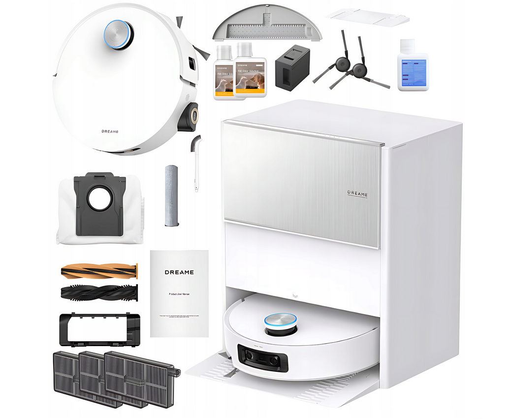 - Wyposażenie - Robot sprzątający- Stacja dokująca- Filtr do stacji dokującej (zainstalowany)- Moduł mopujący (zainstalowany)- 2x Torba na kurz (jedna zainstalowana)- Płyn neutralizujący zapachy zwierząt- Narzędzie do czyszczenia- Podkładka przedłużająca do stacji dokującej - Moduł automatycznego dozownika płynów z dwoma komorami (zainstalowany fabrycznie) - 2x Szczotki boczne- Środek do czyszczenia podłóg 1L- Szczotka HyperStream Detangling DuoBrush- Filtry do zbiornika z kurzem x3- Rolka mopująca- Instrukcja obsługi