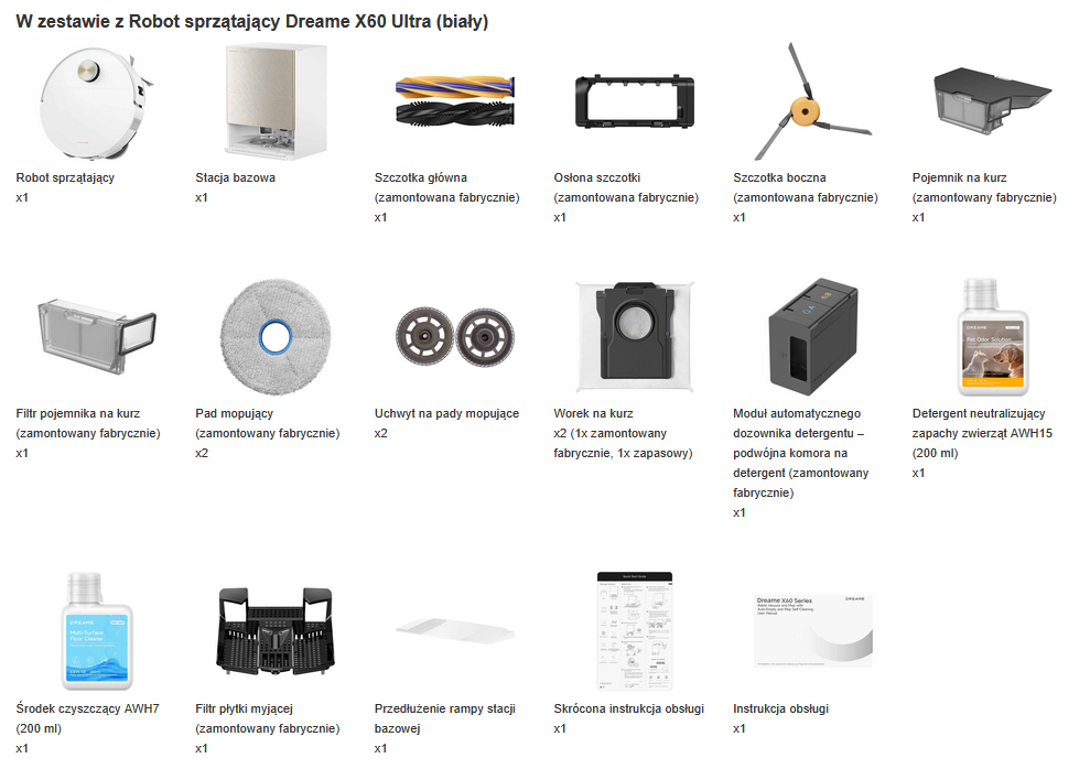 - Wyposażenie - Stacja bazowa- Szczotka główna (zainstalowana)- Osłona szczotki (zainstalowana)- Szczotka boczna (zainstalowana)- Pojemnik na kurz (zainstalowany)- Filtr pojemnika na kurz (zainstalowany)- 2 szt. Pad mopujący (zainstalowany)- 2 szt. Uchwyt na pady mopujące- 2 szt. Worek na kurz (jeden zainstalowany)- Moduł automatycznego dozownika detergentu- podwójna komora na detergent (zainstalowany)- Detergent neutralizujący zapachy zwierząt AWH15 (200 ml)- Środek czyszczący AWH7 (200 ml)- Filtr płytki myjącej (zainstalowany)- Przedłużenie rampy stacji bazowej