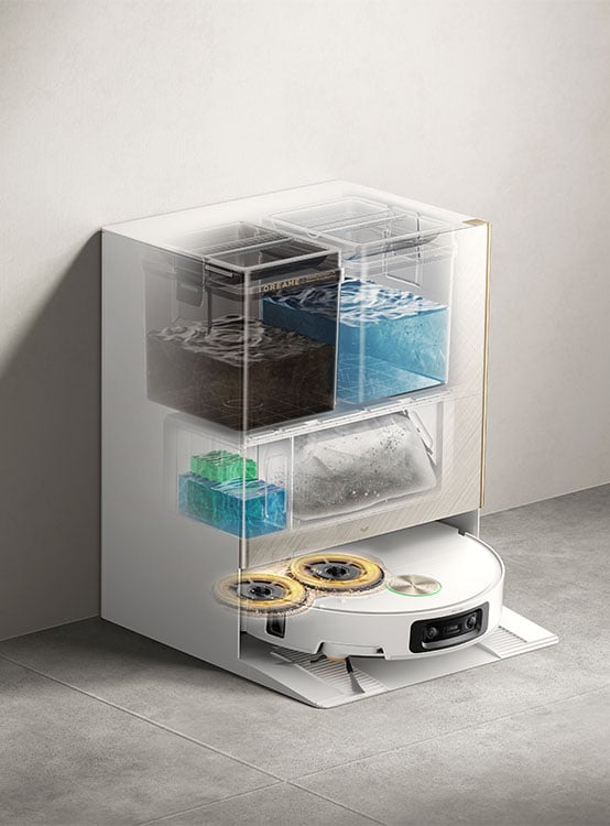 Stacja myje pady wodą o temperaturze do 100°C, suszy je ciepłym powietrzem i opróżnia zbiornik na kurz do worka o dużej pojemności, który może wystarczyć nawet na 100 dni. Dodatkowo umożliwia szybkie ładowanie urządzenia (około 80 minut) i dozowanie dwóch osobnych detergentów – jednego do neutralizowania zapachów zwierząt, a drugiego przeznaczonego do codziennego czyszczenia podłóg. Opcjonalny zestaw do podłączenia do instalacji wodnej, dostępny w oddzielnej sprzedaży, całkowicie eliminuje konieczność dolewania i wylewania wody ręcznie.