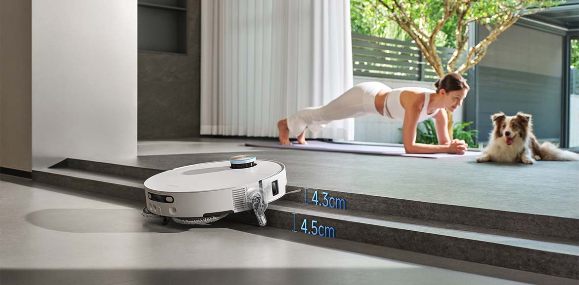 Zastosowanie technologii ProLeap™ z wysuwanymi nogami i ramionami sprawia, że robot łatwo pokonuje przeszkody. Może bez trudu wspinać się na progi i stopnie do 4,5 cm wysokości, a także radzi sobie z podwójnymi stopniami do 8,8 cm łącznie (4,5 + 4,3 cm). System zawieszenia AgiLift™ na trzech kołach zapewnia płynne poruszanie się po dywanach i miękkich powierzchniach, bez ryzyka utknięcia. Takie rozwiązanie gwarantuje swobodę poruszania się po całym mieszkaniu – niezależnie od jego układu.