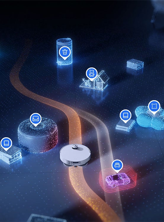 Technologia OmniSight™, oparta na dwóch kamerach szerokokątnych 120° i wsparciu sztucznej inteligencji, pozwala robotowi widzieć i rozpoznawać ponad 280 typów obiektów – w tym kable, papierki i inne elementy o wysokości od 1 cm. Dreame X60 Ultra ocenia, jak blisko może zbliżyć do przeszkody, aby posprzątać skutecznie i bezpiecznie. Dzięki błyskawicznej analizie otoczenia (reakcja w 0,1 s) i zaawansowanemu algorytmowi planowania tras inspirowanemu autonomiczną jazdą robot porusza się szybciej i nie marnuje czasu na zbędne manewry. Dodatkowe oświetlenie LED pozwala mu działać skutecznie również w słabo oświetlonych miejscach.