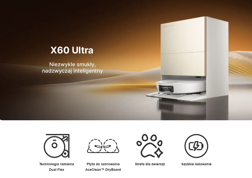 Dreame X60 Ultra to inteligentny robot sprzątający, który samodzielnie dba o porządek w całym domu. Dzięki kompaktowej sylwetce (zaledwie 7,95 cm wysokości), sile ssania Vormax™ do 35 000 Pa oraz wszechstronnej stacji dokującej kompleksowo odkurza i mopuje, nie wymagając zaangażowania użytkownika. To idealny wybór dla rodzin, osób zapracowanych, właścicieli zwierząt oraz każdego, kto ceni sobie czas, skuteczność i perfekcyjną czystość bez wysiłku.