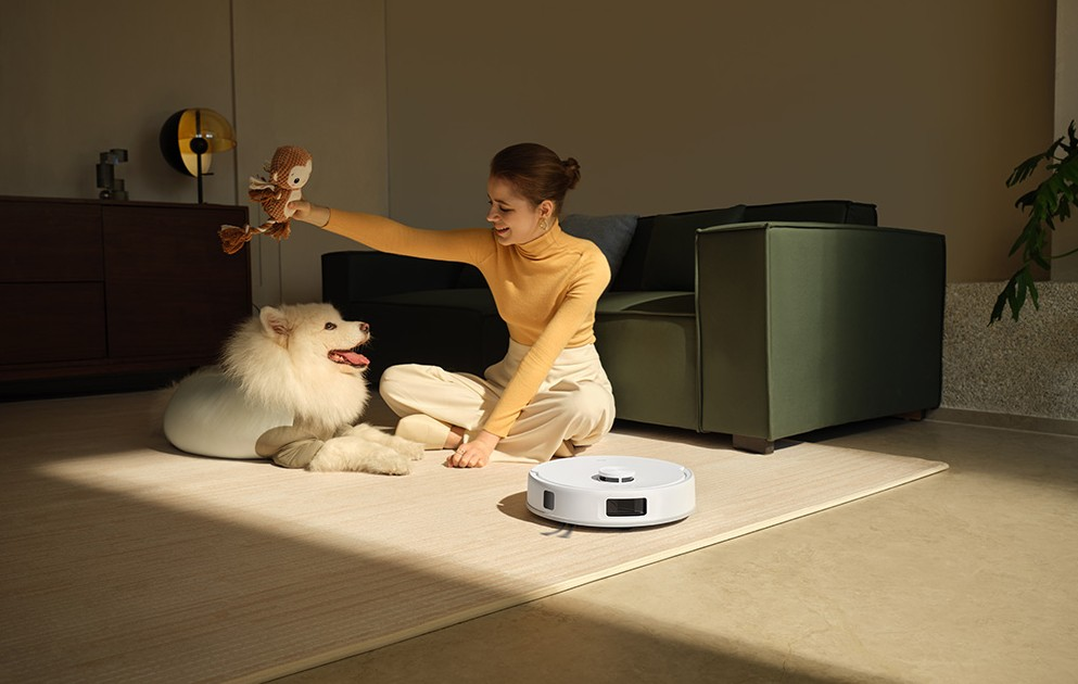 Specjalnie zaprojektowany system zapobiegający plątaniu sprawia, że robot doskonale radzi sobie zarówno z włosami, jak i sierścią zwierząt. Szczotka boczna w kształcie litery U skutecznie rozplątuje włosy, kierując je do wnętrza robota. Szczotka główna o kształcie “V” precyzyjnie zbiera kurz, okruchy i zanieczyszczenia z dywanów, szczelin oraz twardych podłóg. Całość uzupełnia innowacyjny system kierowania powietrza z grzebieniem antysplątaniowym, który tworzy silny przepływ powietrza, minimalizując owijanie się włosów wokół wałka i zapobiegając zapychaniu pojemnika na kurz.