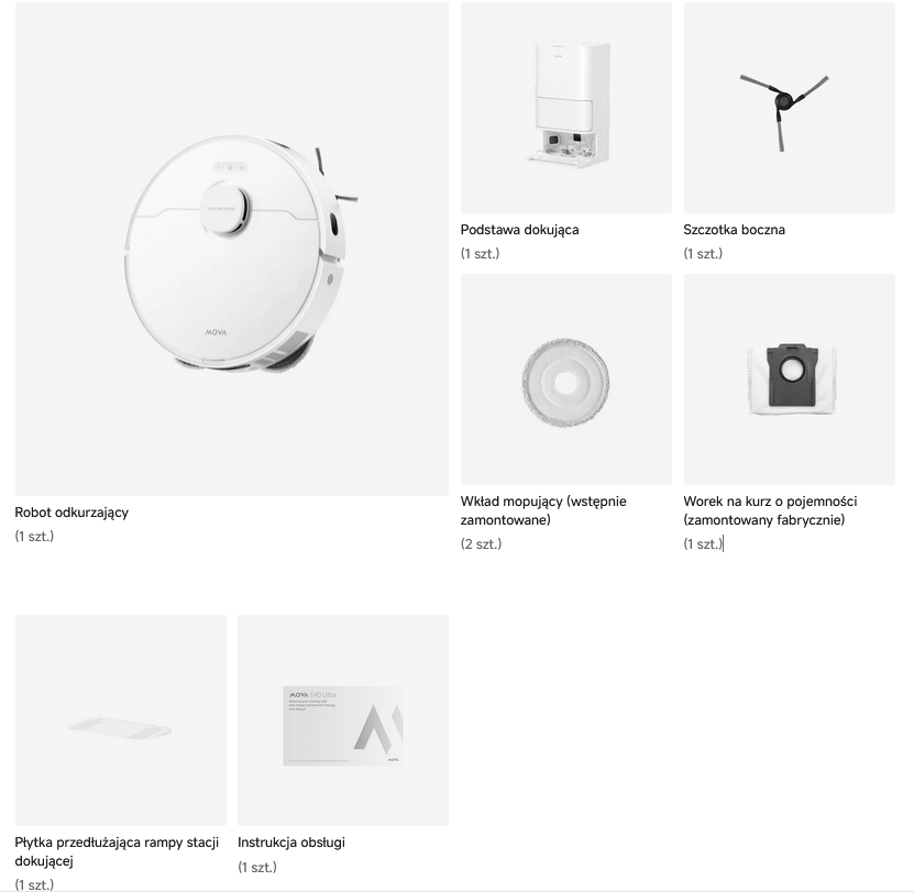 - Wyposażenie - Stacja dokującaSzczotka boczna (zamontowana)- 2 szt. Pady mopujące (zamontowane)- 2 szt. Uchwyt na pady mopujące- Worek na kurz 3.2L (zamontowany)- Płyta przedłużająca do stacji dokującej- Instrukcja obsługi