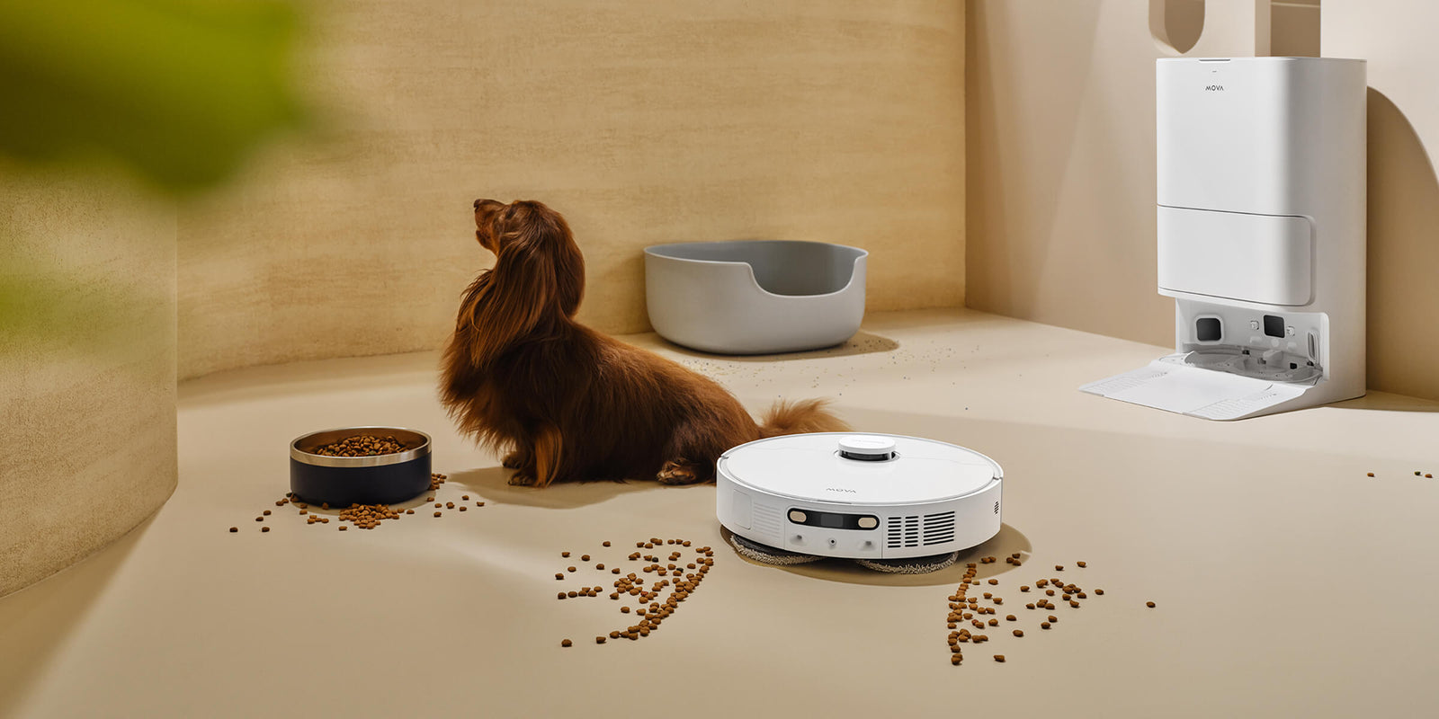 Odkurzacz E40 Ultra inteligentnie rozpoznaje legowiska i miski z karmą dla zwierząt, skanuje przestrzeń, w której przebywa zwierzę, i zwiększa częstotliwość odkurzania, aby zapobiec gromadzeniu się sierści.