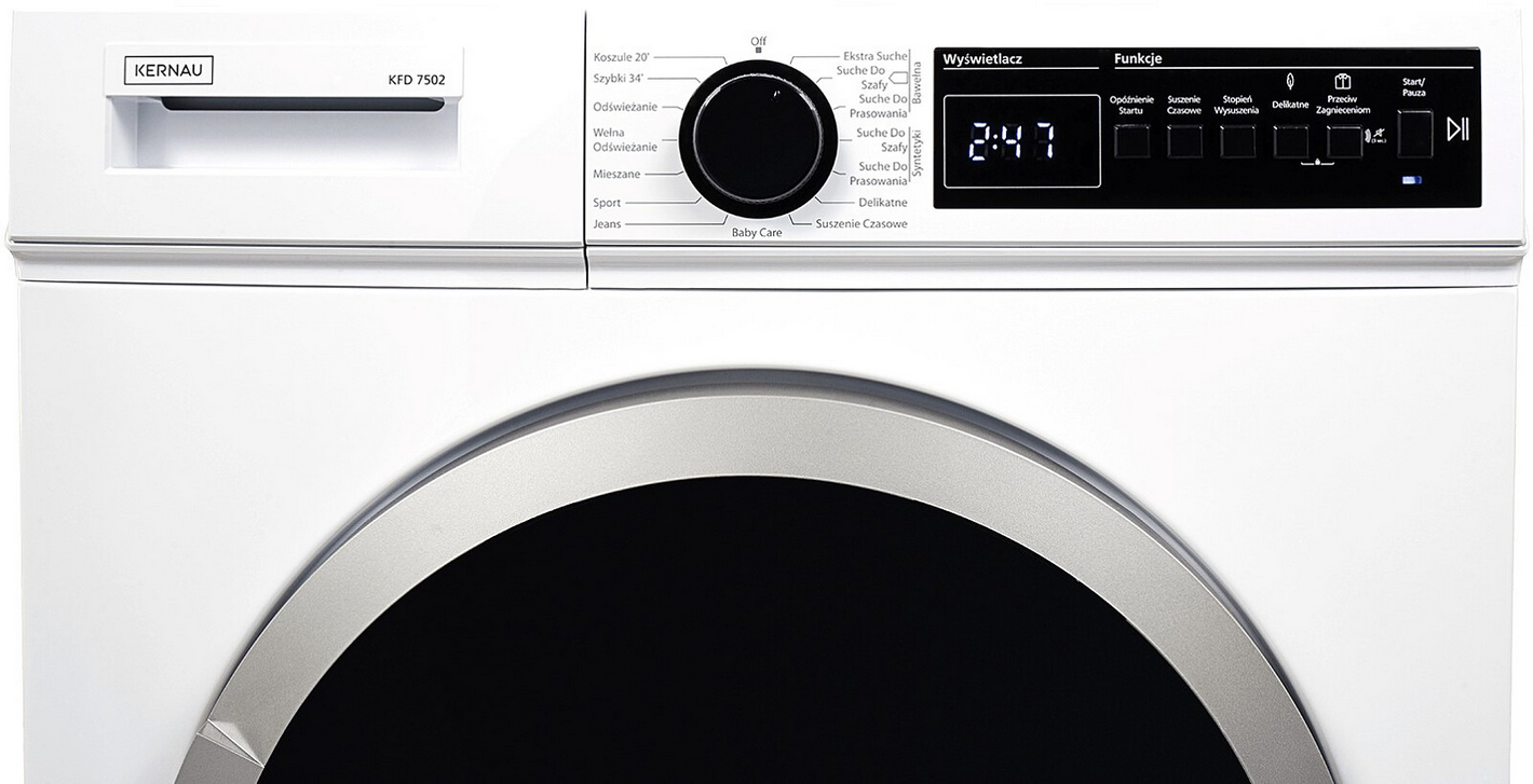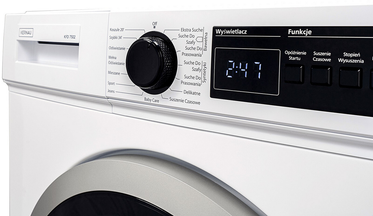 - Programy suszenia Bawełna extra sucha, Bawełna gotowa do szafy, Bawełna do prasowania, Syntetyki gotowe do prasowania, Delikatny, Czasowe suszenie, Baby care, Jeansy, Sportowe, Mieszane, Wełna odświeżanie, Odświeżanie, Szybki 34', Koszule 20'