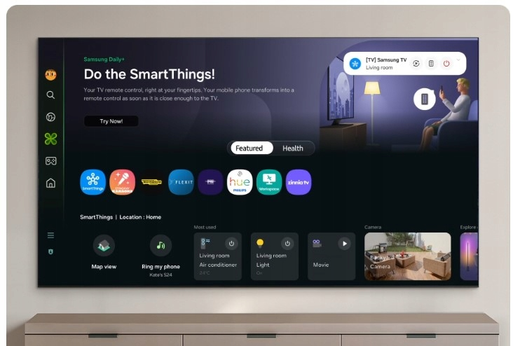 Za pośrednictwem aplikacji mobilnej SmartThings możesz uzyskać dostęp do kluczowych funkcji Smart TV Tizen telewizora Samsung, takich jak multimedia, funkcje, tryb Ambient i menu. Twój smartfon może również pełnić funkcję pilota do telewizora, umożliwiając Ci zmianę kanałów, regulację głośności i jeszcze więcej opcji – bezpośrednio z telefonu.