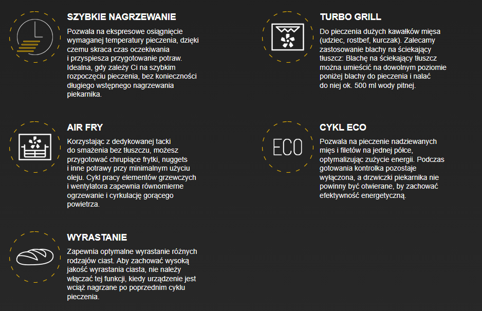 - Rodzaje programów Para, Zapiekanie, Mięso, Pieczenie chleba, Pizza, Kruche ciasto, Konwencjonalne, Grill, Termoobieg, Pieczenie konwekcyjne, Szybki rozgrzew, Turbogrill, Eco, AirFry, Wyrastanie ciasta