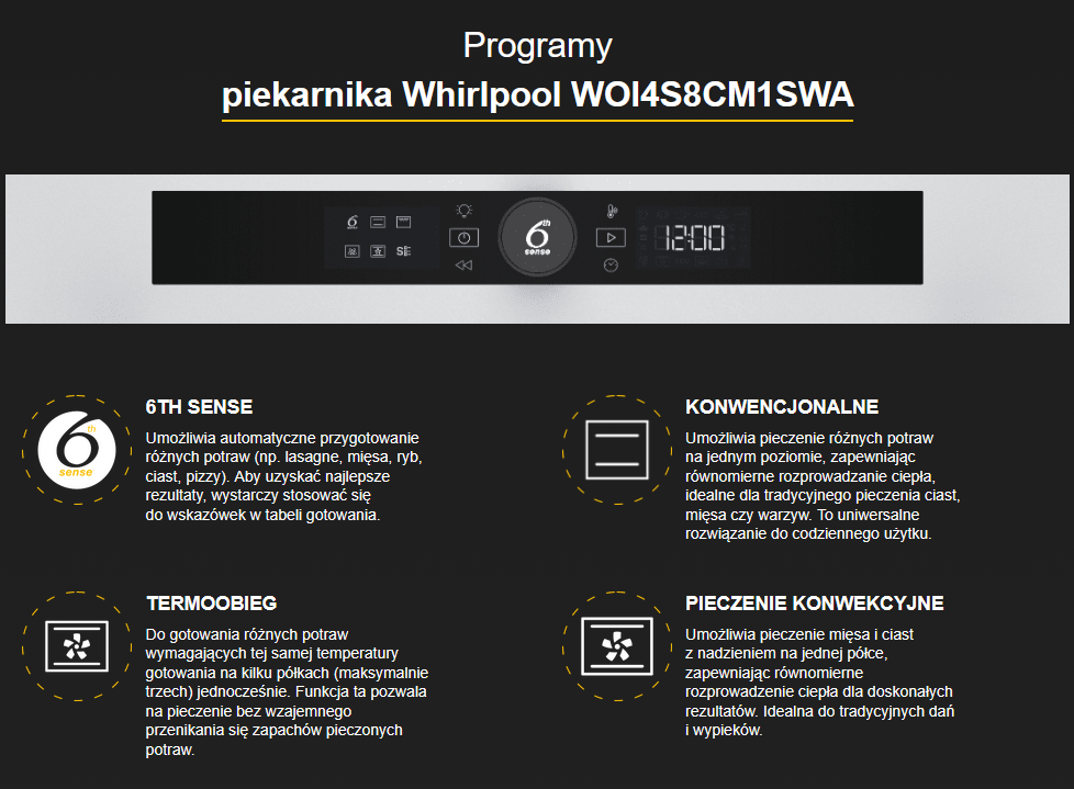 Technologia 6. Zmysł automatycznie zarządza funkcją pieczenia, temperaturą i czasem, aby zapewnić idealne rezultaty za każdym razem. Inteligentne czujniki monitorują proces pieczenia i dostosowują parametry w czasie rzeczywistym, eliminując ryzyko przypalenia lub niedopieczenia potrawy.Dzięki temu pieczenie jest w pełni zautomatyzowane – piekarnik zakończy pracę dokładnie wtedy, gdy danie osiągnie idealną gotowość. Nie musisz zgadywać ani kontrolować procesu – bez stresu, bez wysiłku, tylko doskonały smak w Twojej kuchni.