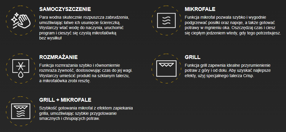 - Rodzaje programów Odgrzewanie, Gotowanie, Crisp, Czyszczenie parowe, Rozmrażanie, Grill, Mikrofale z grillem