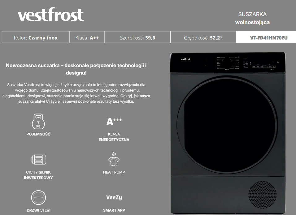 Zestaw Vestfrost Pralka VW-FD4B1270PL 7kg + Suszarka Vestrfost VT-FD41HN70EU 7kg