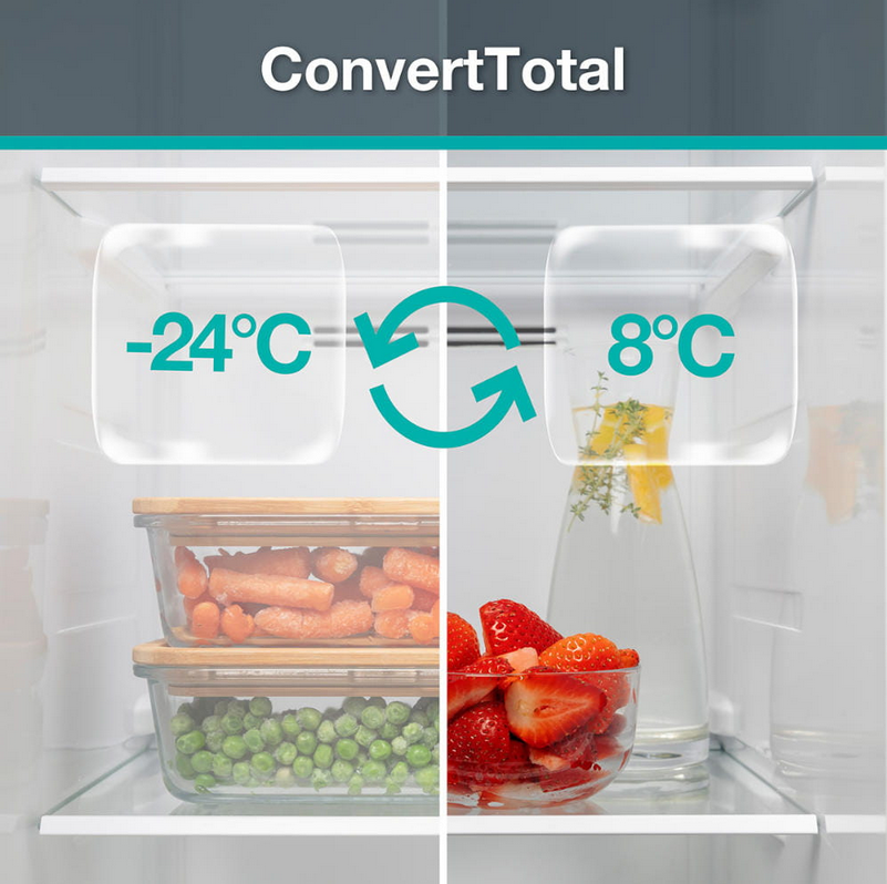 Świeże czy mrożone? Nasza innowacyjna funkcja ConvertTotal umożliwia regulację temperatury w zakresie od -24°C do +8°C, bez wysiłku przekształcając komorę lodówki z zamrażarki w chłodziarkę. Doświadcz swobody, aby z łatwością zaspokoić wszystkie wymagania dotyczące przechowywania. Ciesz się najwyższą elastycznością temperaturową dzięki funkcji ConvertTotal, która zapewnia najwyższą wszechstronność temperaturową dla wszystkich potrzeb związanych z przechowywaniem.