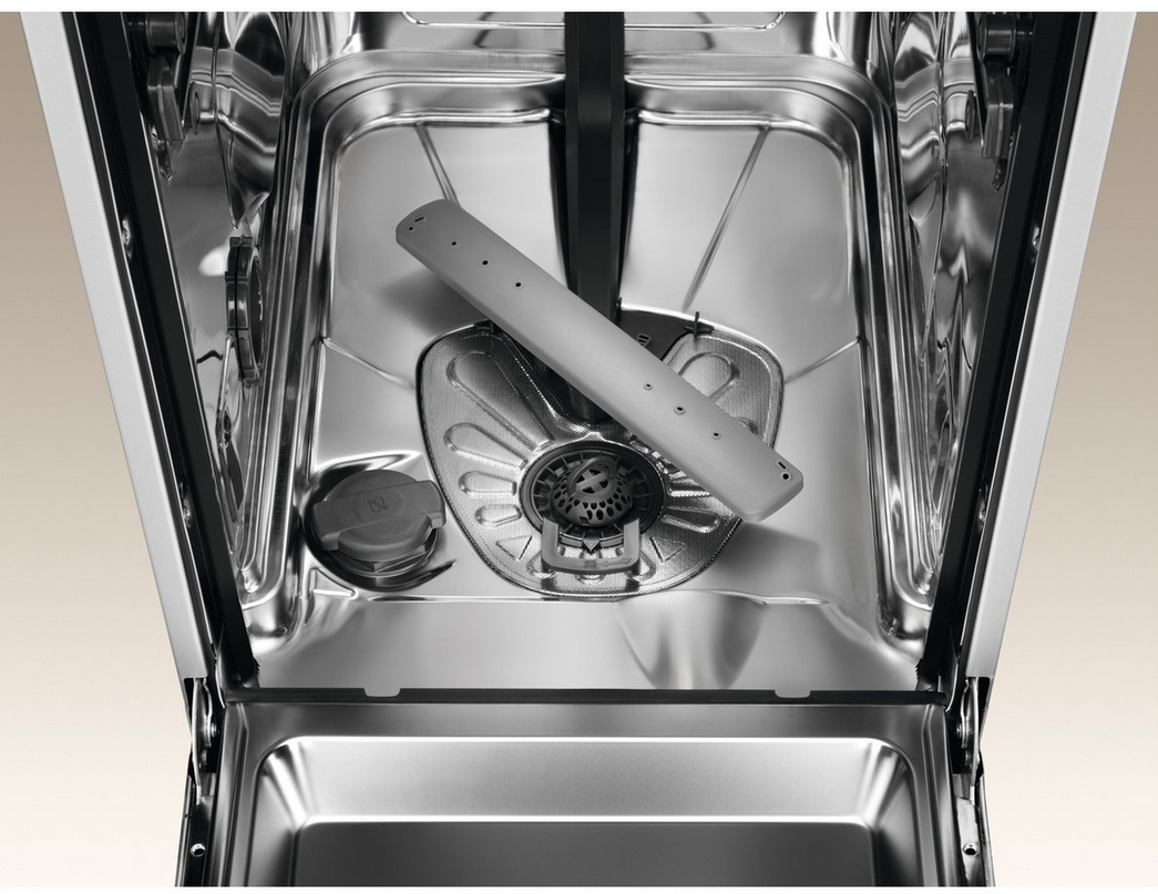 Dwa rotacyjne ramiona spryskujące sprawiają, że wszystkie naczynia są idealnie czyste, ponieważ woda jest równomiernie rozprowadzana po całym urządzeniu.