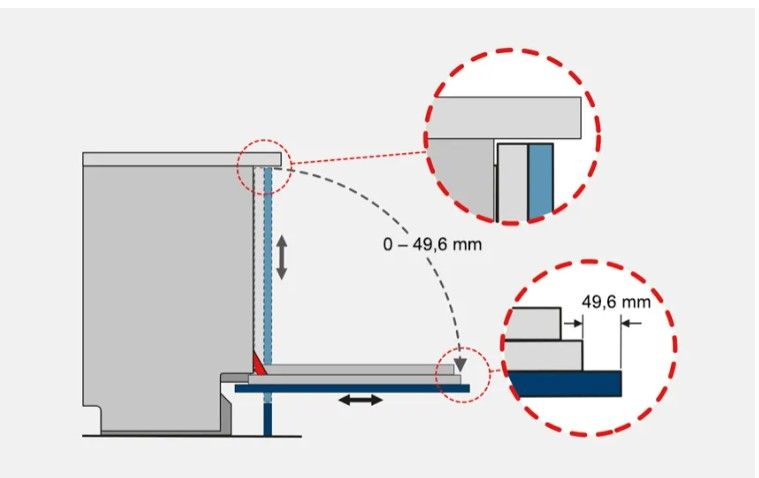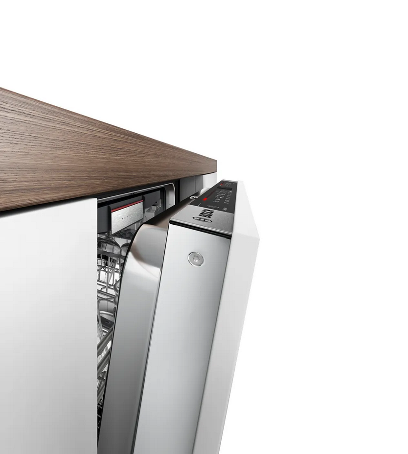 to perfekcyjne rozwiązanie problemu pojawiania się widocznych szczelin pod frontem zabudowanego urządzenia. Zawiasy w pełni zintegrowanej zmywarki sprawiają, że front meblowy przesuwa się przy otwieraniu urządzenia lekko do góry. W ten sposób wyeliminowana została nieestetyczna szczelina, która towarzyszyła zwykle wysokiej zabudowie zmywarek. Teraz front wpasowuje się precyzyjnie w architekturę sąsiednich szafek.