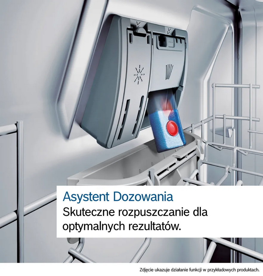 Asystent Dozowania zapewnia optymalne rezultaty poprzez wydajne rozpuszczanie tabletki czyszczącejAsystent Dozowania pozwala zoptymalizować działanie tabletek. Kapsułka spada do pojemnika w górnym koszu, a potem jest sukcesywnie rozpuszczana. Detergent prawidłowo miesza się z wodą co pozwala umyć naczynia z jeszcze większą siłą i gwarantuje perfekcyjny efekt czystości.
