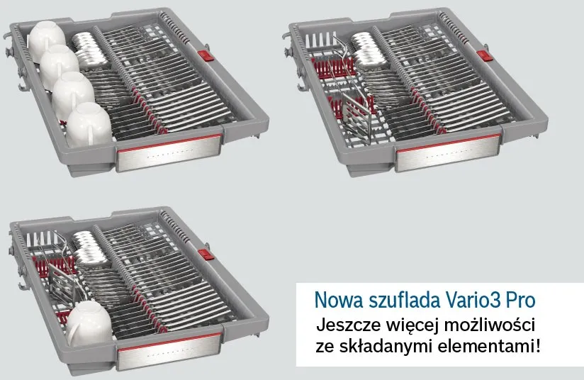 Szuflada Vario3 Pro - więcej opcji konfiguracji dla Twojego załadunkuTeraz możesz jeszcze wygodniej użytkować swoją zmywarkę z trzecim poziomem załadunku. Dzięki szufladzie Vario3 Pro wykorzystasz całe wnętrze. Umieścisz tam nie tylko sztućce ale i małe akcesoria kuchenne. Opuszczany bok szuflady uwalnia również głębszą przestrzeń na mycie małych filiżanek do espresso czy łyżek wazowych.