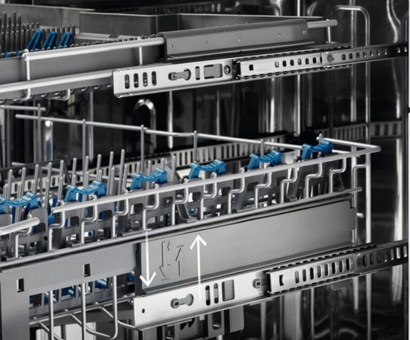 Bez względu na to, czy będziesz wkładać, czy wyjmować naczynia – zrobisz to wygodnie dzięki konstrukcji kosza QuickLift. Nawet gdy górny kosz jest w pełni załadowany, QuickLift pozwala Ci szybko podnieść i opuścić półkę, by naczynia i narzędzia kuchenne różnych kształtów i rozmiarów tam pasowały.