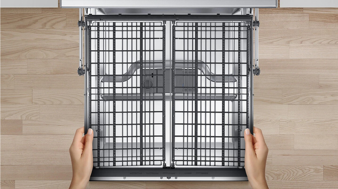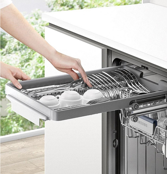 Wygodniej zmywaj sztućce i duże kuchenne akcesoria, korzystając z trzeciego kosza. Łatwo i szybko układaj w tej dedykowanej przestrzeni przybory i bez trudu je stamtąd wyjmuj. W porównaniu z wyposażonymi w dwa kosze modelami firmy Samsung rozwiązanie to pozwala uzyskać więcej miejsca w pozostałej części komory zmywarki.