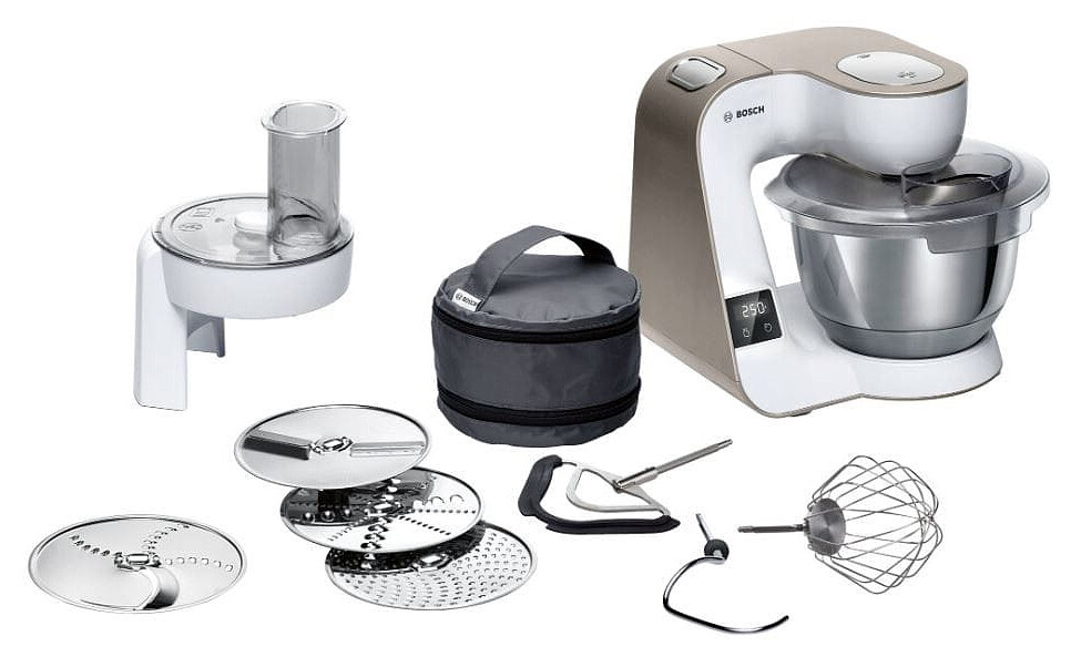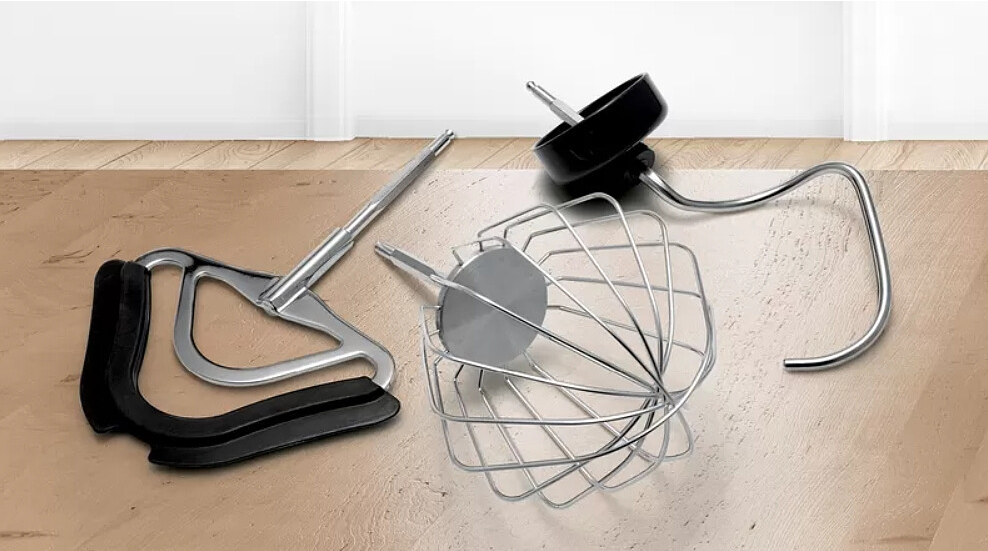 Kreatywne pomysły kulinarne wymagają specjalnych akcesoriów. Profesjonalny zestaw mieszadeł zapewnia nie tylko doskonałe rezultaty, ale i łatwą obsługę urządzenia. W zestawie: mieszadło z silikonową krawędzią, mieszadło do ubijania (z regulacją wysokości, wykonane w całości z metalu) oraz hak do zagniatania. Wszystkie akcesoria można myć w zmywarce.