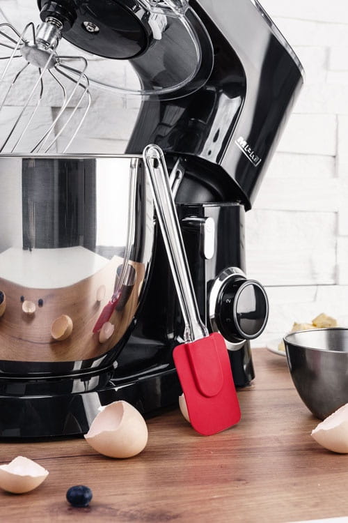 - Mieszadło z silikonowym wykończeniem idealne do wyrabiania ciasta drożdżowego a także makaronu i faworków. Specjalny kształt i silikonowe ściągacze sprawiają, że ciasto jest dokładnie ściągane z brzegów misy.
