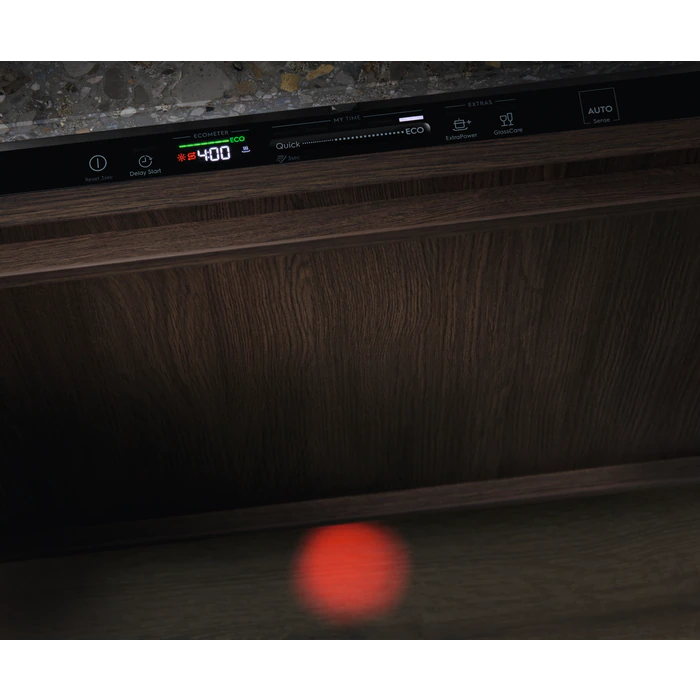 Wyświetlacz podłogowy to sposób na zapewnienie ciszy i spokoju w Twojej kuchni. Zamiast emitować głośny sygnał dźwiękowy, który można przeoczyć wśród innych odgłosów, nasza zmywarka informuje o swoim stanie, wyświetlając kolorową kropkę na podłodze.